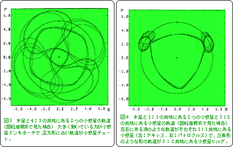 ついでに、1:1共鳴や3:2共鳴について図4に示します。この図では3つの小 惑星の軌道が描かれています。まず、左右で小さな渦を描くように動いているのが トロヤ群と呼ばれる小惑星の群に属する2つの小惑星の軌道で、これが1:1共鳴 です。1:1共鳴というのは、木星と同じ周期で動いている訳ですから、このよう に木星から一定のところで運動しています。また、膨らんだ三角形の軌道を描いて いる方が3:2の共鳴にある小惑星です。この3:2の共鳴にある小惑星をヒルダ 群と呼んでいます。