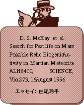 今年の3月、ジョンソン宇宙センターで開かれた第28回月惑星科学会議の中心は火星生命に関するものであったが、特に「火星隕石と生命」と題する特別セッションは宇宙センターの講堂を超満員にした。もちろん、昨年8月、NASAの記者会見でD.S.McKay等の発表した「初期火星の原始的生命の証拠」に端を発した問題である。門外漢の筆者に討論の詳しい内容はよくわからないのであるが、この会議に限らず、今回のトピックスに関連する動きを極めて側面的に、且つ独断で解釈をすると次のようになる。
