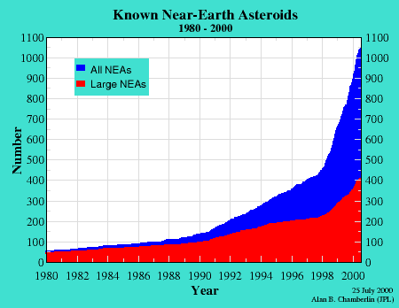 NEAの地球衝突確率は月面のクレータの分布から求められている。一般的には、小惑星の直径の20倍くらいのクレータが形成される。これによると、種の大絶滅を起こし得る直径10キロメートルサイズのものは約1億年に1回位ある。直径10キロメートルの小惑星はかなり明るいので(1天文単位の距離で13等級位)、全てのものがすでに見つかっている。おそらく直径3−5キロメートル位までは全て見つかっていると言ってよい。そして、それらが近いうちに(100年以内に)地球に衝突することはない。直径1キロメートルサイズのものについては月面クレータからだけでは正確な衝突確率を示すことは難しく、数千個が未発見であると考えられていた。この場合、衝突確率は数十万年に1回ということになる。しかし、アメリカの5つのチーム(表1)による精力的な観測により、図3のように現在までに400個もの直径1キロメートル以上のNEAが見つけられており、その統計から総数は800−1,000個という説が有力になってきた。つまり、約100万年に1回の衝突確率になる。